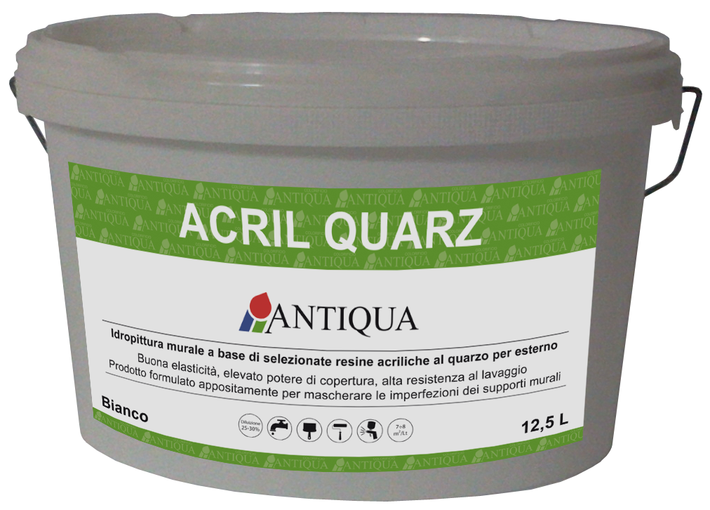 Idropittura murale al quarzo per esterno a base di resine acriliche in emulsione acquosa e cariche silicee, possiede un elevato potere di copertura e nasconde perfettamente le irregolarità del supporto. Inoltre protegge al massimo, grazie alla resina acrilica con il quale è formulato i supporti cementizi dall’aggressione alcalina. I supporti verniciati con ACRIL QUARZ hanno un aspetto estetico opaco.
